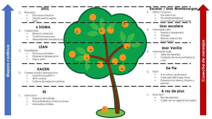 Lo anterior, así como el aprendizaje en mis clases de maestría y Six Sigma Black Belt, con don Edwin Garro, en relación con la importancia de “cosechar” primero las “low hanging fruits” cuando se refiere a mejora de procesos y todo esto ligado al hecho de que en mi juventud me ganaba un dinero extra recolectando limones en mi casa para venderlos en sodas y bares en mi pueblo; me hicieron adoptar la metáfora de ver la mejora continua como bajar naranjas de un árbol.