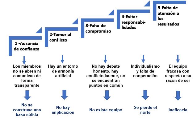 Al respecto, Patrick Lencioni, escritor estadounidense ha escrito un libro denominado “Las cinco disfunciones de un equipo”.  En este libro se evidencia cuáles son las causas de estas y cuáles serían las acciones para solucionarlos y volverse cohesionados que a continuación se presenta como una síntesis al respecto.